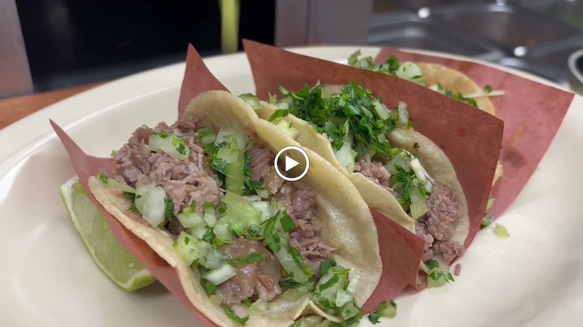 homemade corn tortilla, braised shredded beef, Cheese, pickled onion, cilantro